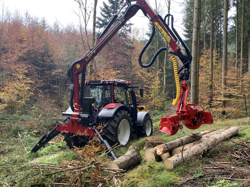 TAPIO 350 HARVESTERcon misurazione della lunghezza e del diametroPeso 285 kgVelocità spinta 0,8 m /secPotenza sramatura 20 kN a 160 bar, 23,75 kN a 190 barDiametro max abbattimento 350 mmDiametro max sramatura 300 mmTAJFUN DOT 50 K, gru forestale a tre punti con supporto idraulicoPeso 1450 kgSbraccio gru: 7,25 m / 710 kg- Comando EHC con 2 Joystick- Autofornitura del olio- Radiatore a olio- Set di tubi idraulici ¾“, acciaio/flessibile